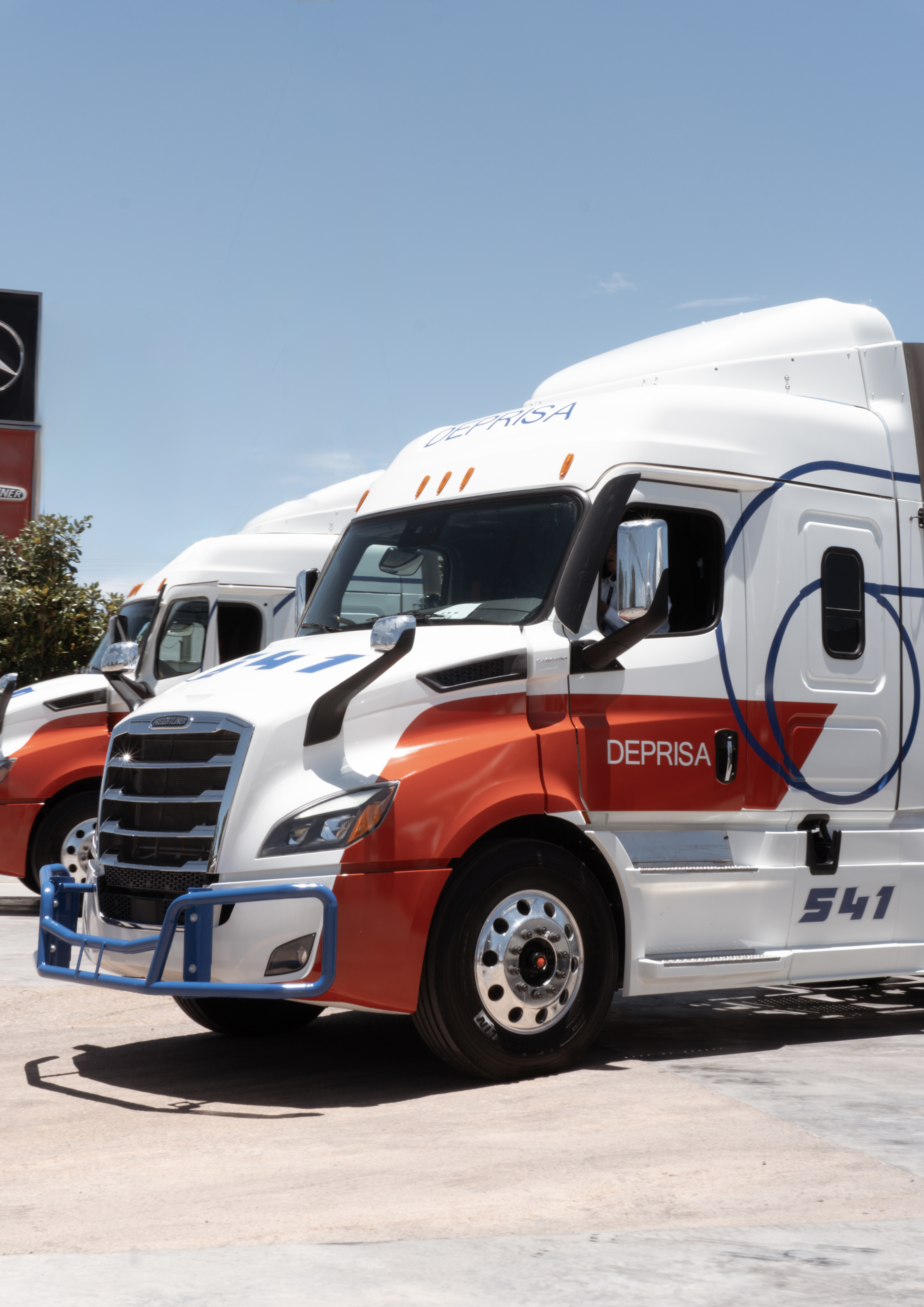 Transportamos vehículos ligeros y carga pesada utilizando nuestra flota de tractocamiones Freightliner Cascadia e International LT con cajas secas de 53 pies y capacidad hasta 30 toneladas.